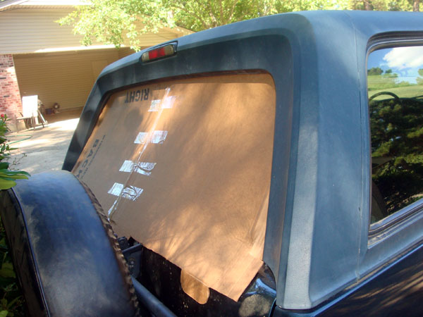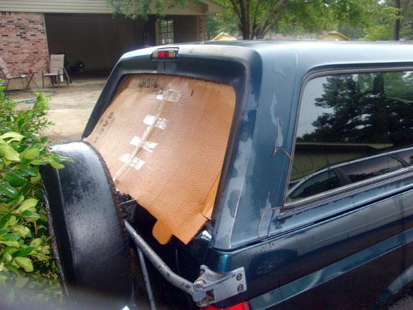 Something impacted the back window of the bronco and the back window just shattered. I stopped the car and inspected it and even debated about pulling the window out and just leaving it on the ground, but thought that since I didn't have any gloves on I should wait until I returned home before attempting it. Once home, I decided that the best thing to do was to find some cardboard and insert it into the window opening to keep out critters and any rain water that might fall. This conclusion was only reached after I couldn't find an open junk yard, or glass shop within a 3 hour drive of my house. The joys of living in rural America. |