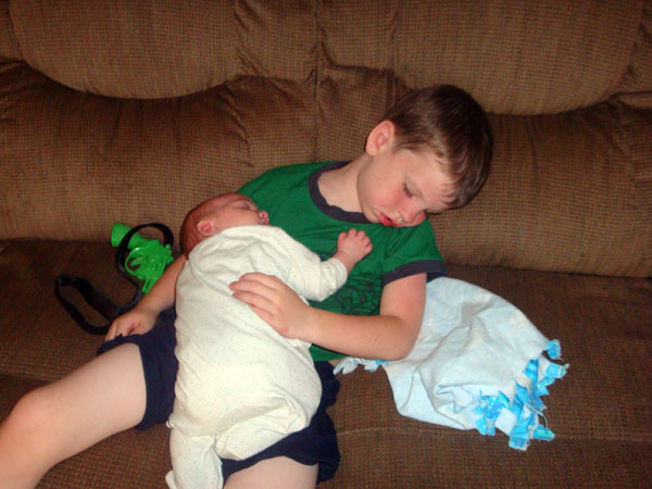 Kyle is like the other two kids in that he can't seem to get enough of holding Landen. He is not like the other kids in that he needs a nap on a daily basis. Rachel still occasionally needs a nap (or else she is grouchy and hateful) but she fights tooth and nail to take one. Kyle on the other hand falls asleep when he is in the car for extended drives (10 minutes) or if he is watching TV. The other to can't fall asleep while watching TV. |