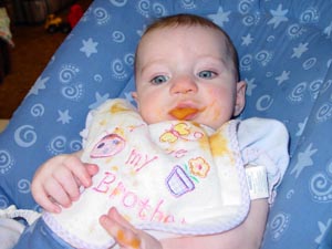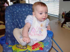 We started Abbie on sweet potatoes this week and she likes them. She has got the swallowing thing just about figured out at this point. It is hard to believe she is five months old today. It seems like we just brought her home . . . time flies I guess.