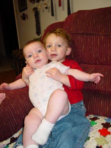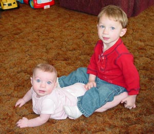 They are really fun to watch together. They are going to be good friends I think, well after they are done tormenting each other. Wyatt loves his sister and she is just dying to get up and go with him, I don1t think it will be long before she does. He will take her by the hand and say walk then (with some assistance) he will walk her around the room.